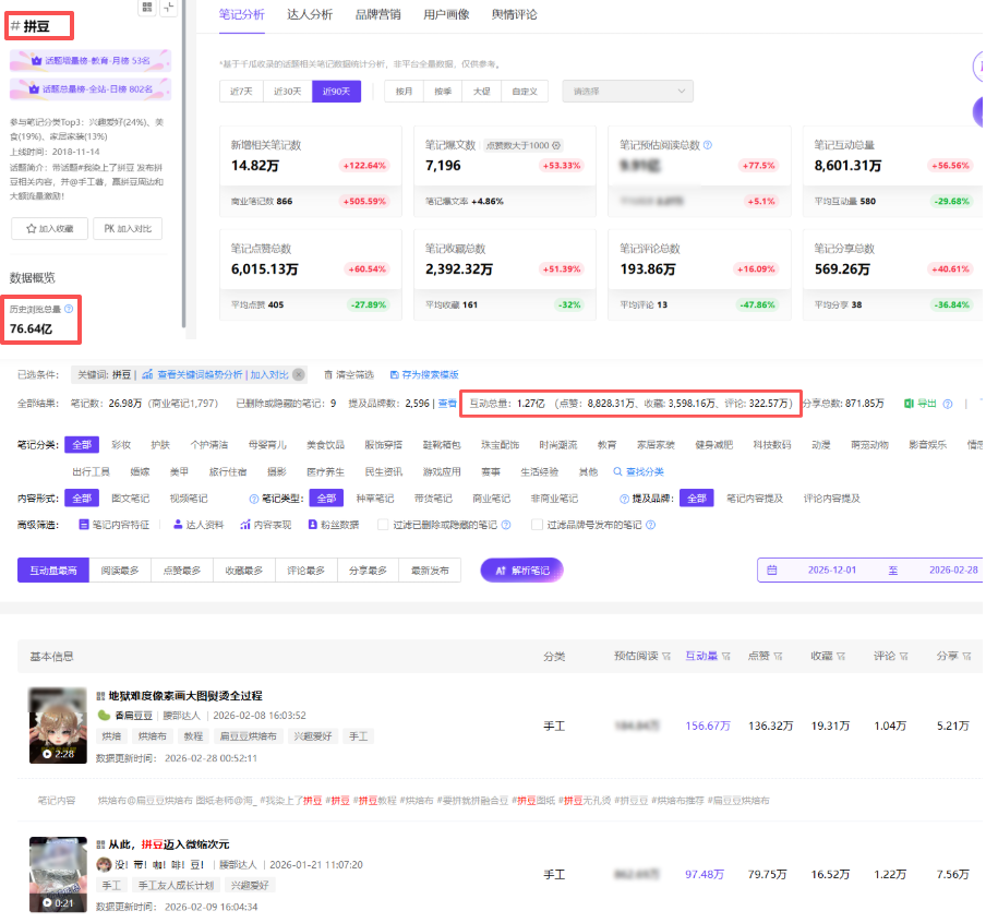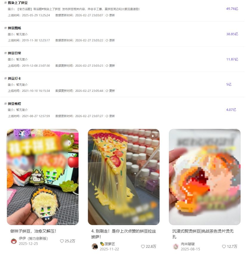 平台数据显示,话题#拼豆 浏览量高达76亿+,近90天笔记数疯狂增长122%+,预估互动达8600万+!不仅如此,近90天内“拼豆”相关笔记总互动破亿,热门笔记单篇点赞更是高达136万+。