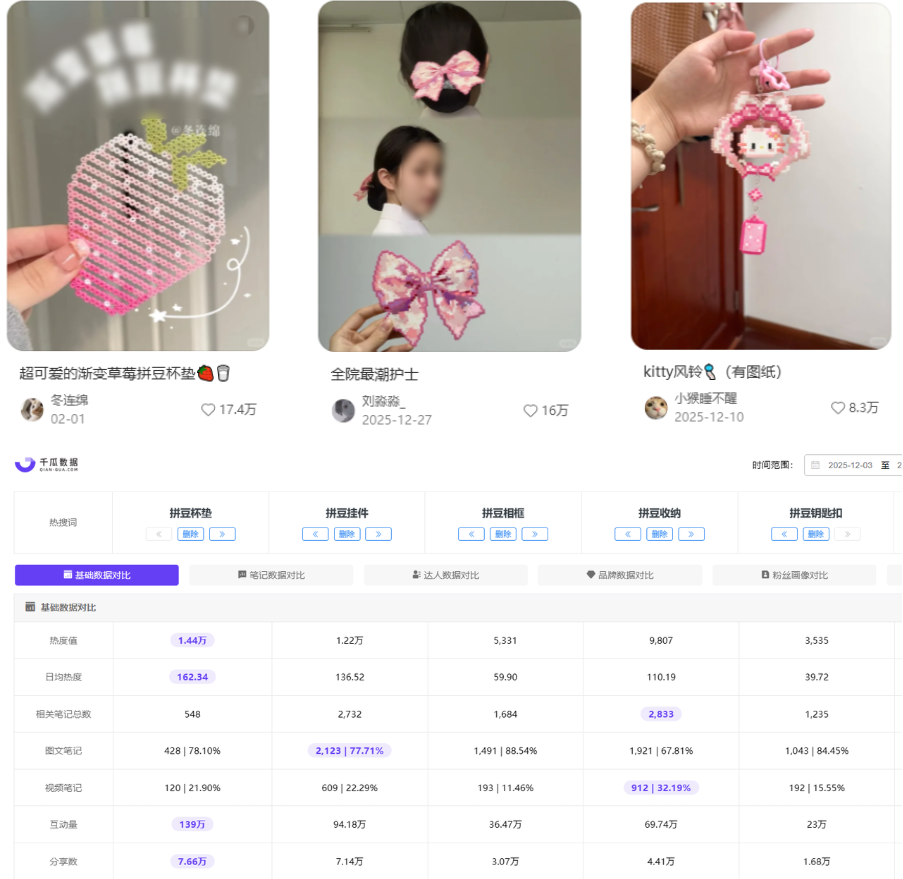 比起无意义的摆件,大家更爱兼具实用性的手作,杯垫、发饰、挂件...千瓜数据显示,热搜词涵盖了“拼豆杯垫、拼豆挂件、拼豆相框、拼豆钥匙扣”等,其中“拼豆杯垫”近90天互动最高,预估互动直达百万级!